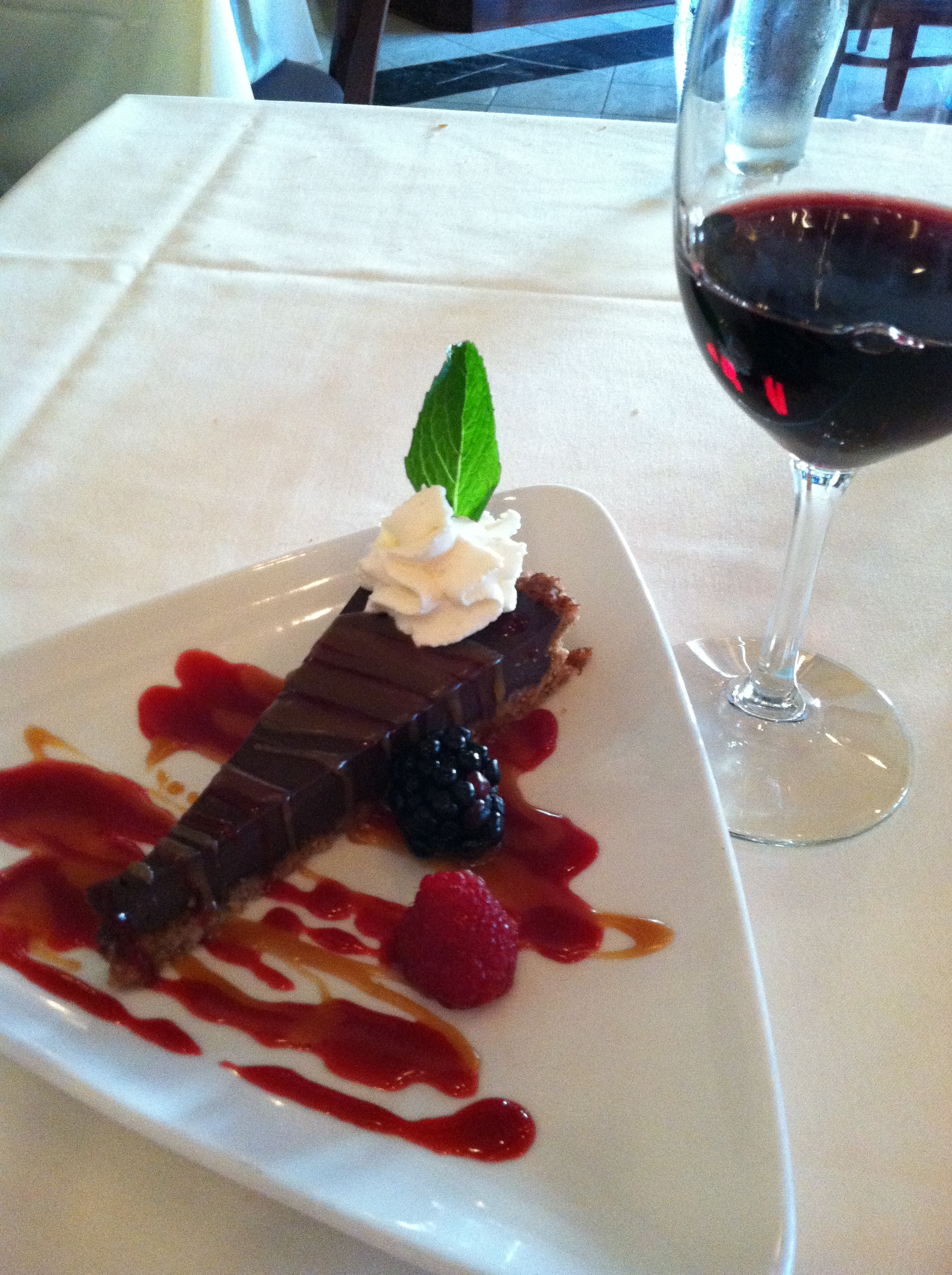 Dessert temptations were vast, from white chocolate pound cake with lemon curd and fresh berries, peach and cherry cobbler, vanilla bean creme brulee to chocolate ganache in a toasted pecan crust with raspberry coulis and spicy caramel sauce. We couldn’t resist the chocolate and ordered two more half glasses of wine.