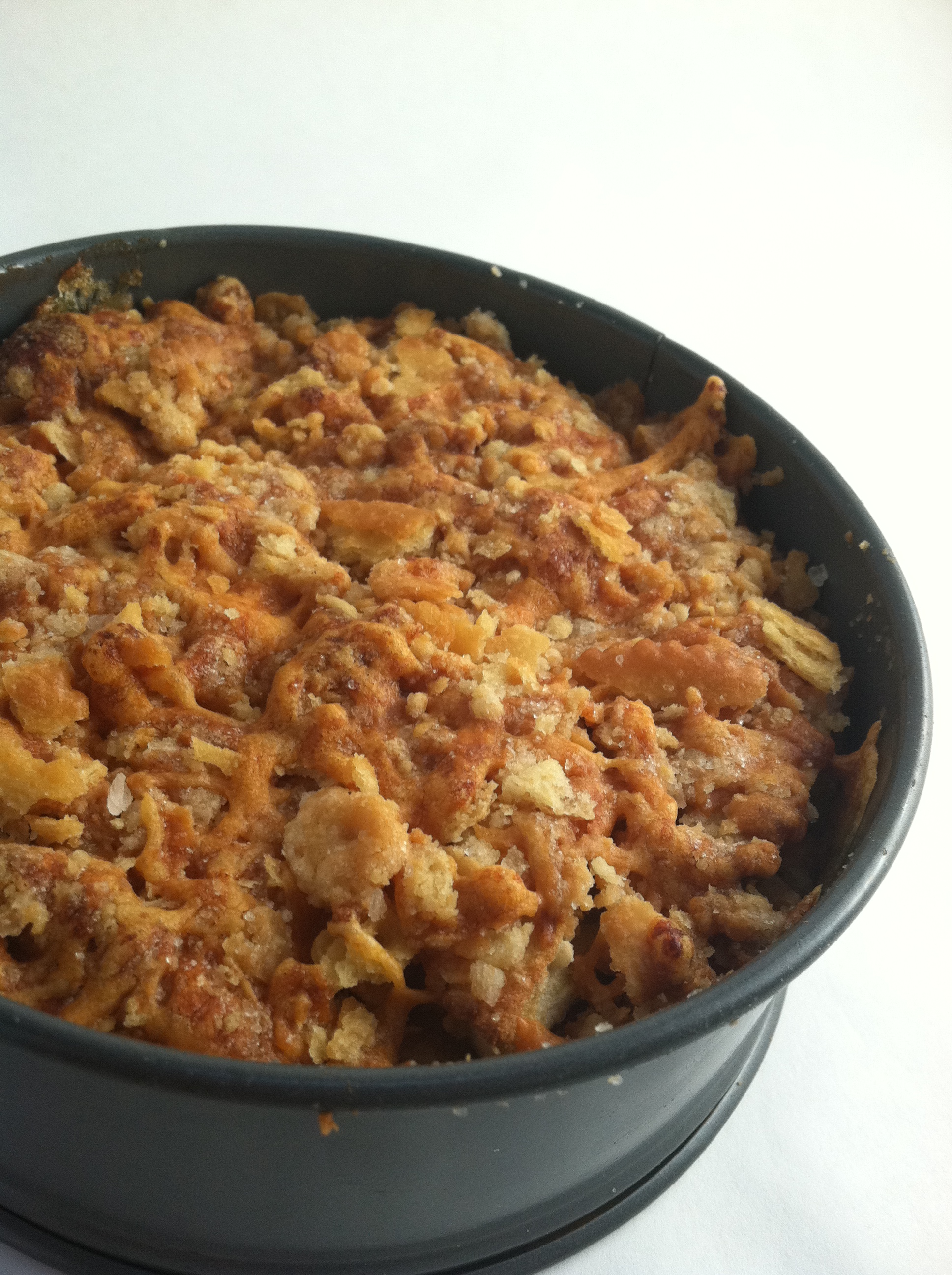 Place the casserole on a sheet pan and put it into an oven pre-heated to 350°F. Bake for 40 minutes or until the topping is golden brown and the dish is bubbly. Remove and cool slightly before serving.