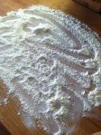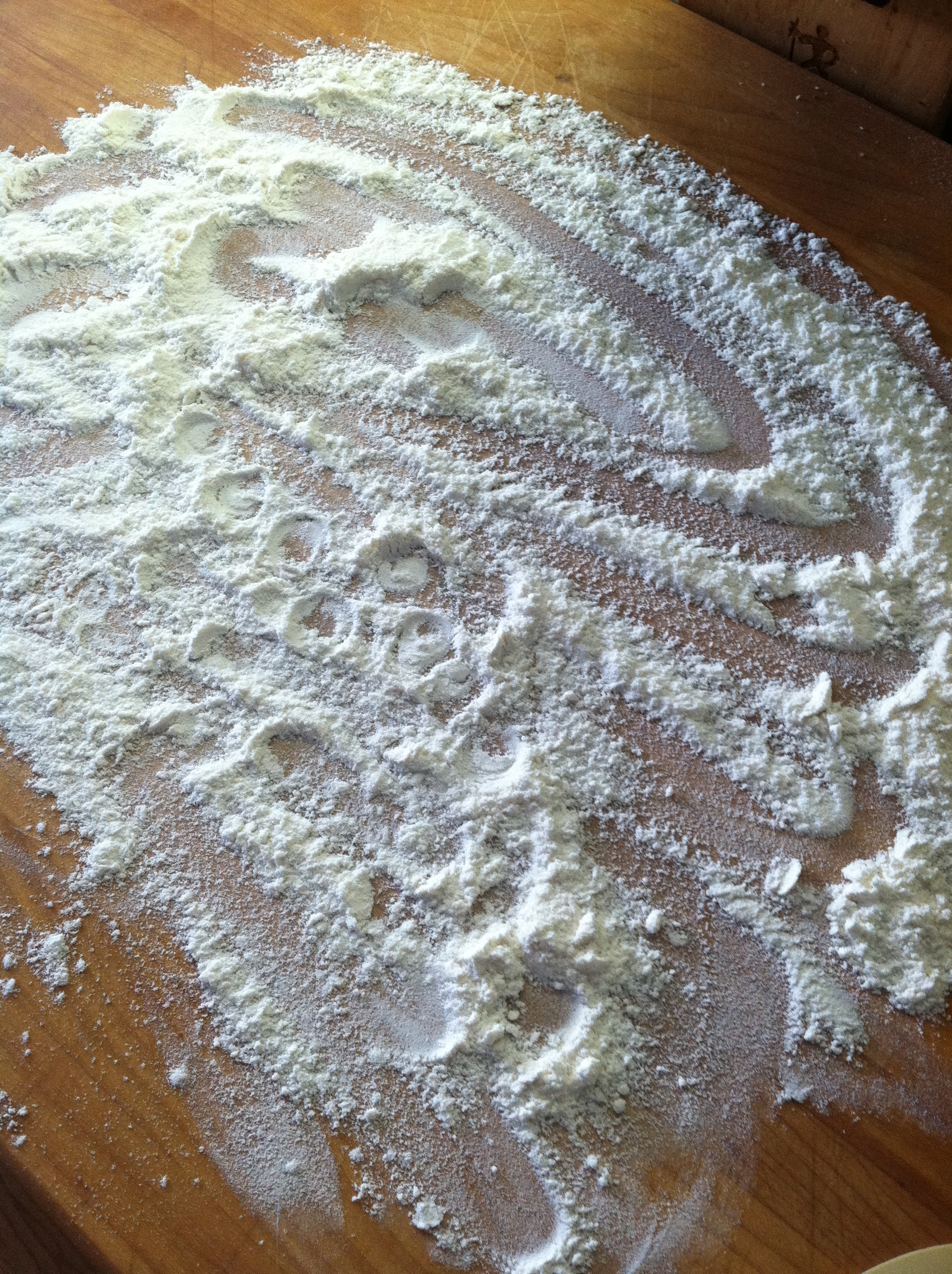 Cover any sticky spots with flour so the surface feels smooth and not sticky. Using a well floured rolling-pin, work the dough into a rectangle about 1/2 inch thick.