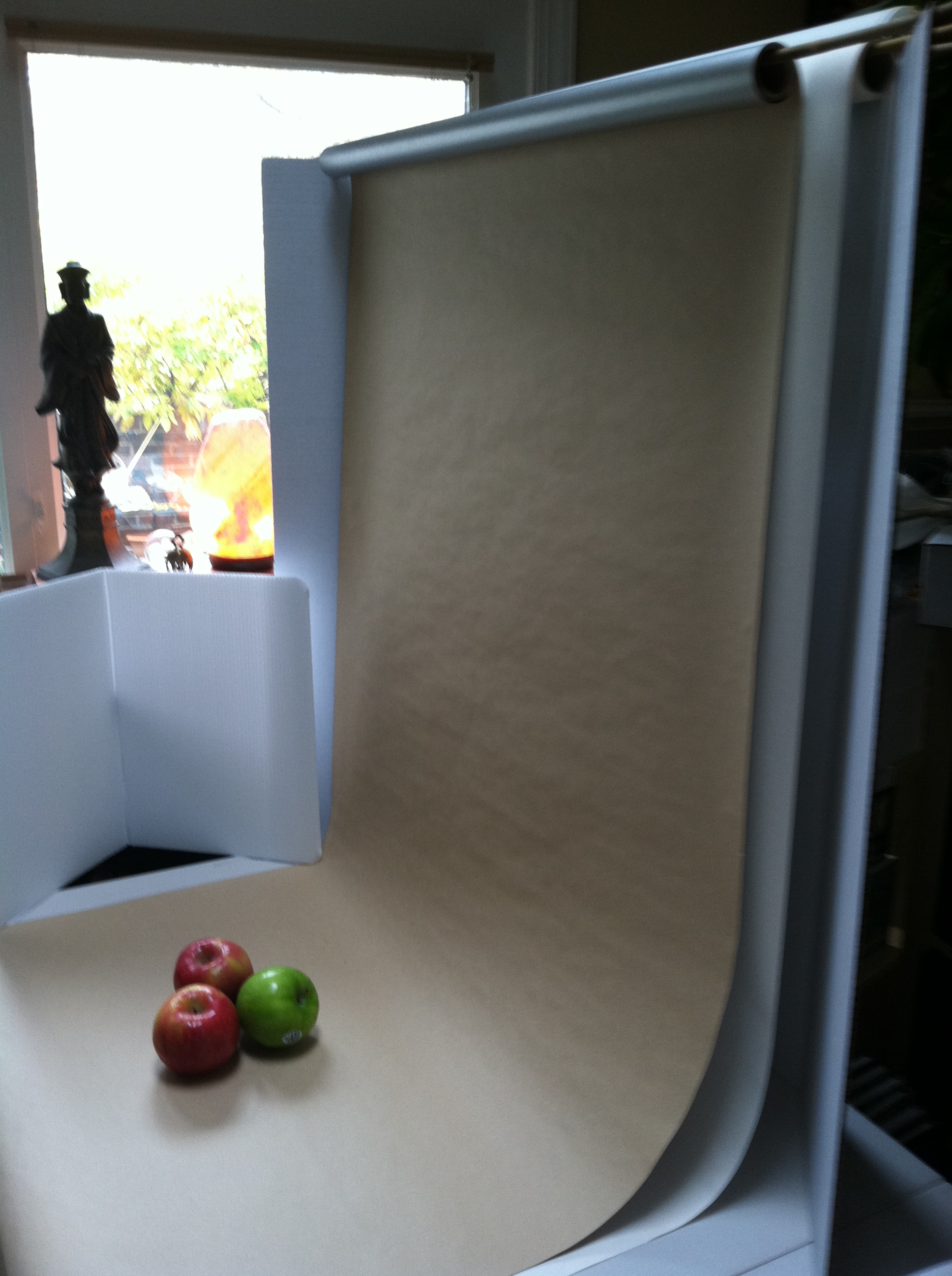 Notice the background, how the angle curves, everything clean. No smudges, dust or particles. While the apples are not a perfect shot, you can see how easy it is to set up your own work area and play.