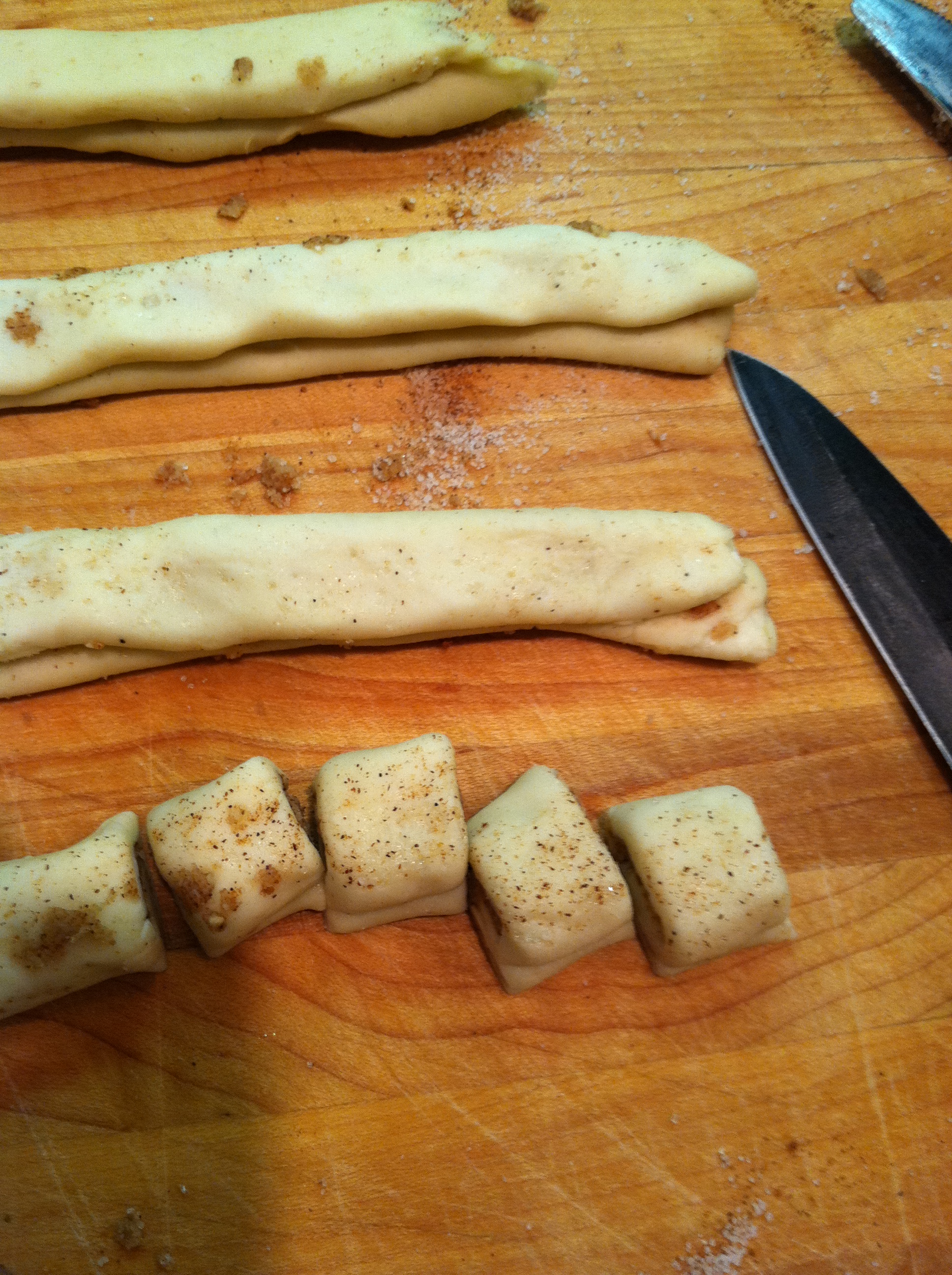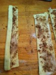 Spread dough strips with butter and sprinkle with cinnamon sugar