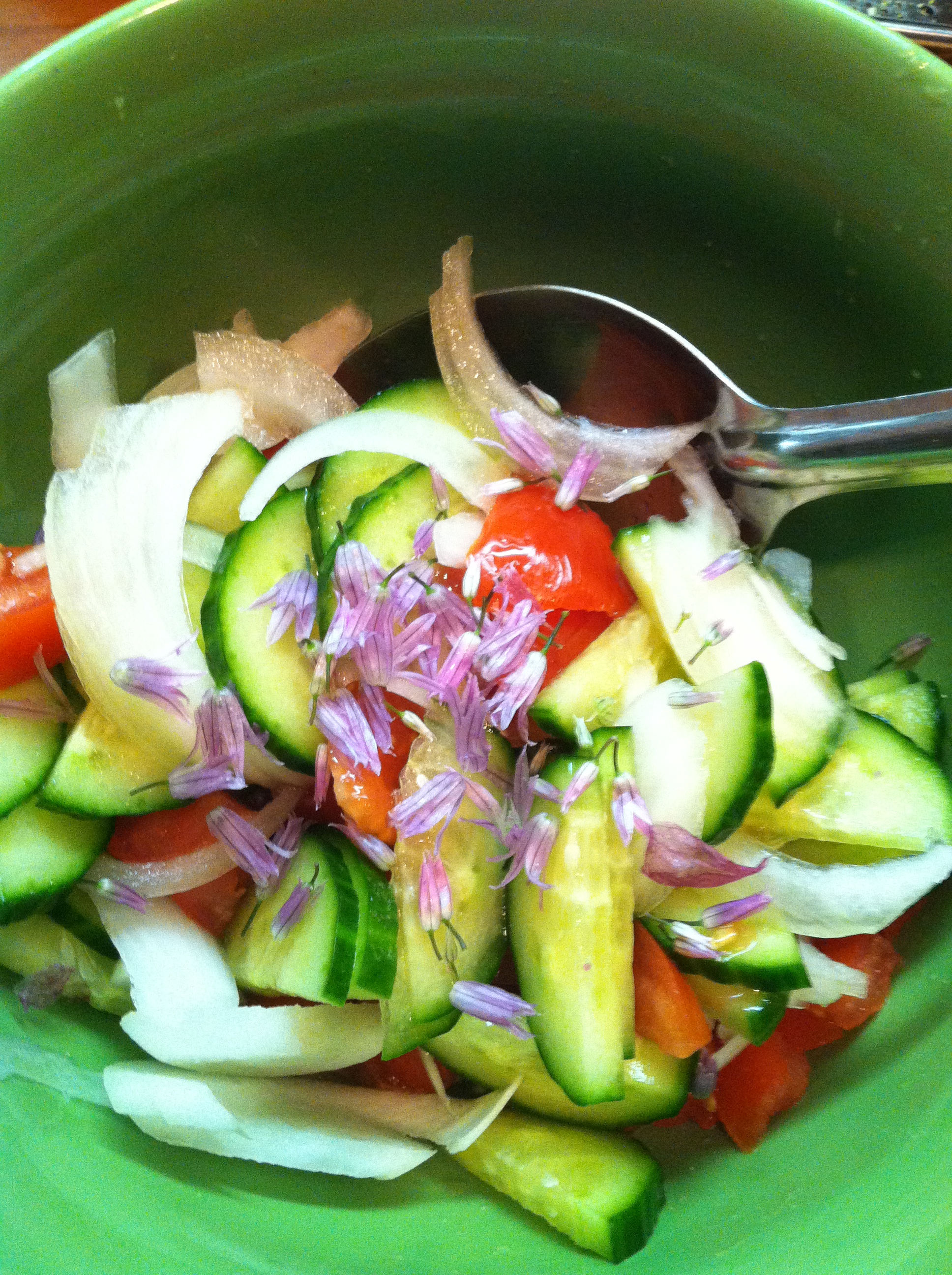 Chive Blossom Vinaigrette over Tomato, Onion, Cucumber Salad