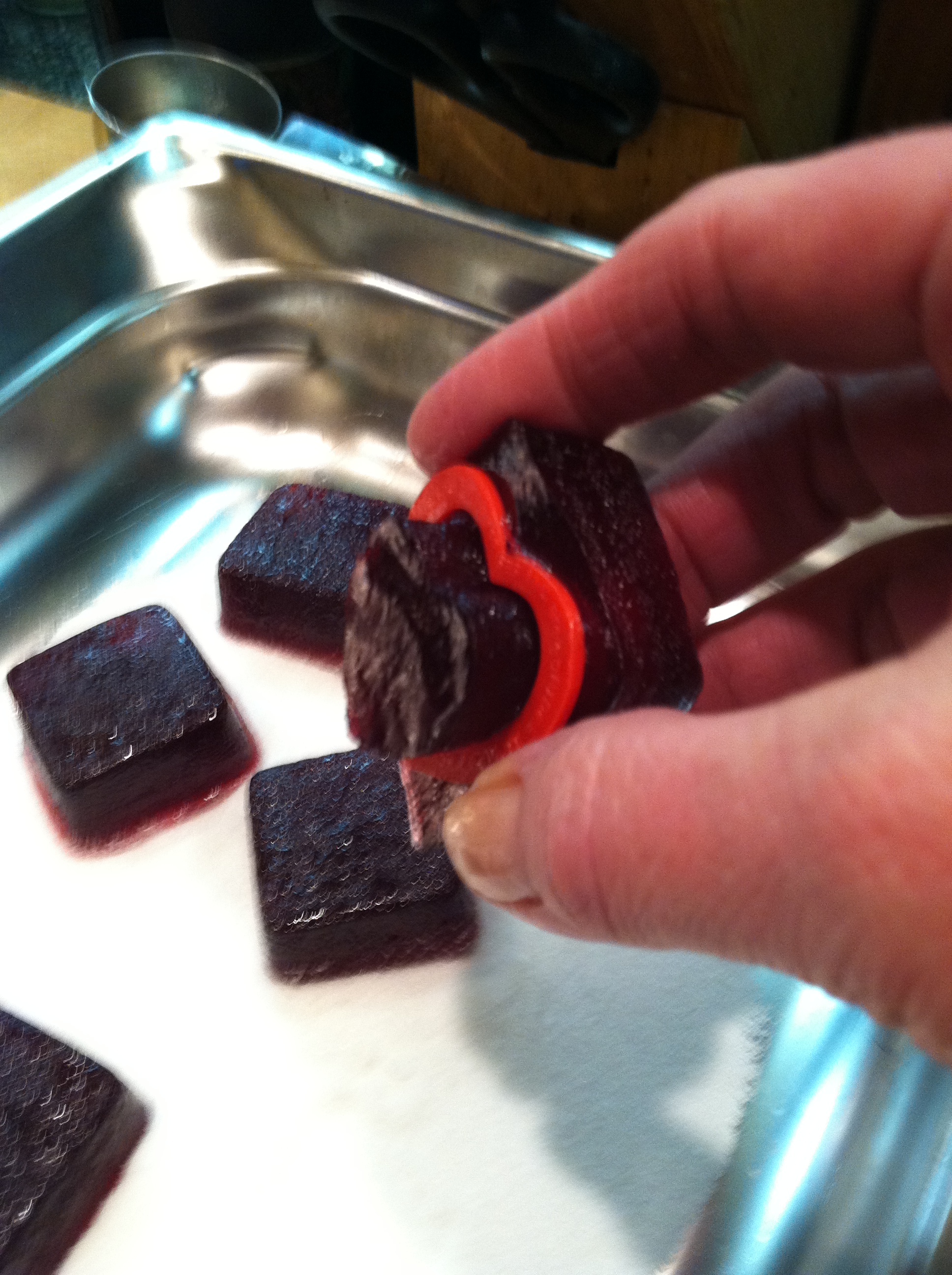 If you made one pan, remove the geleé to a cutting board and cut into desired shapes.