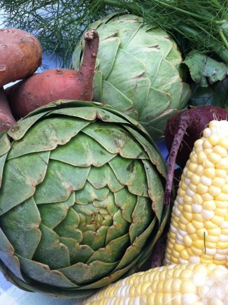 All food gathered from a walk to the farmers market Saturday and shared bounty from friends and colleagues. Oh, add salmon, wild caught, from Alaska.