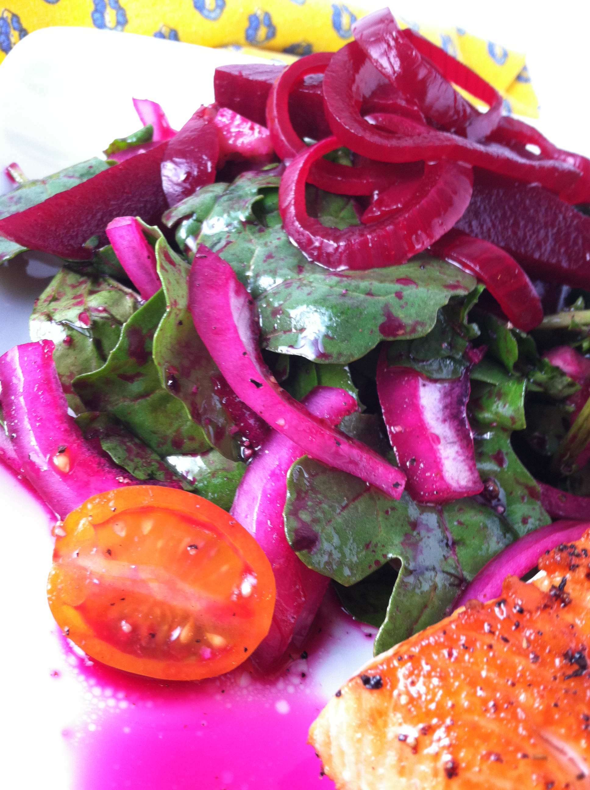 You could use the beet juice from the pickling jar and drizzle a bit of olive oil for the dressing.