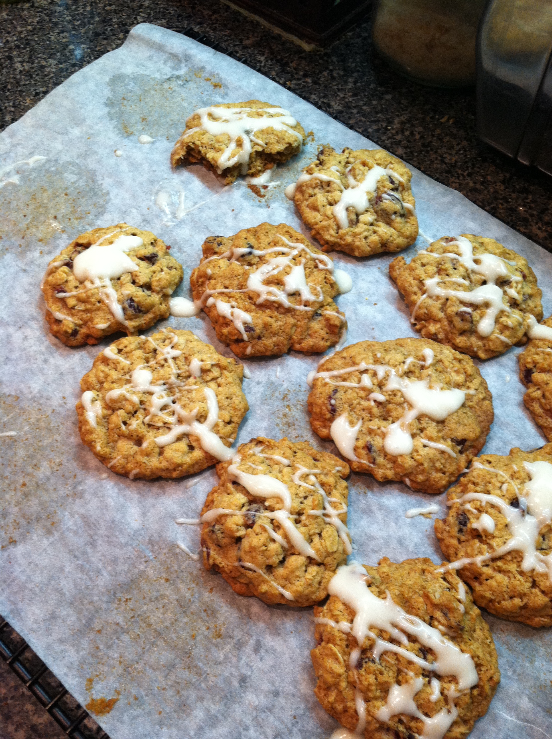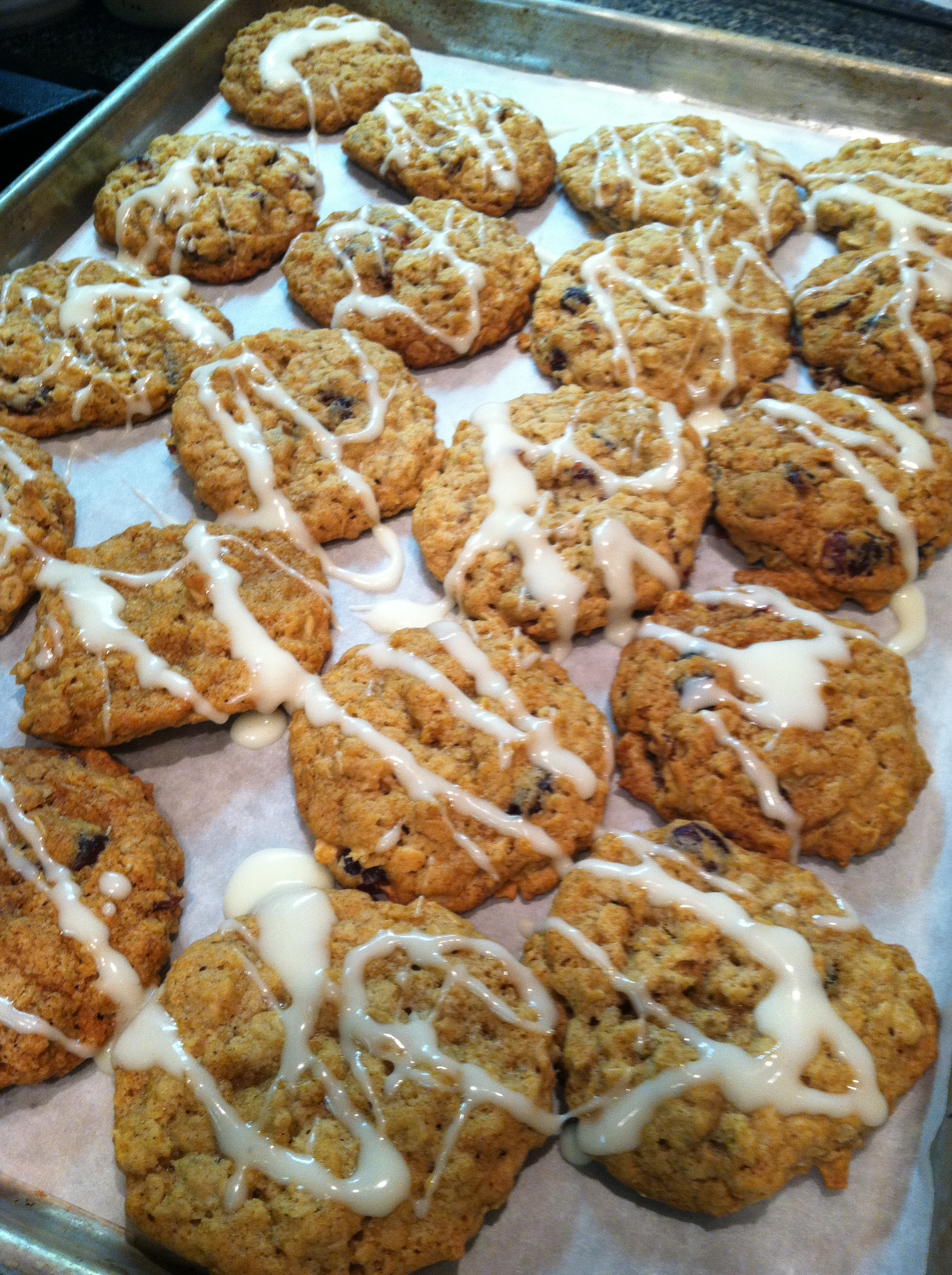 Drizzle the cookies with icing. Make note of the parchment and tray under the cookies to catch icing drips.