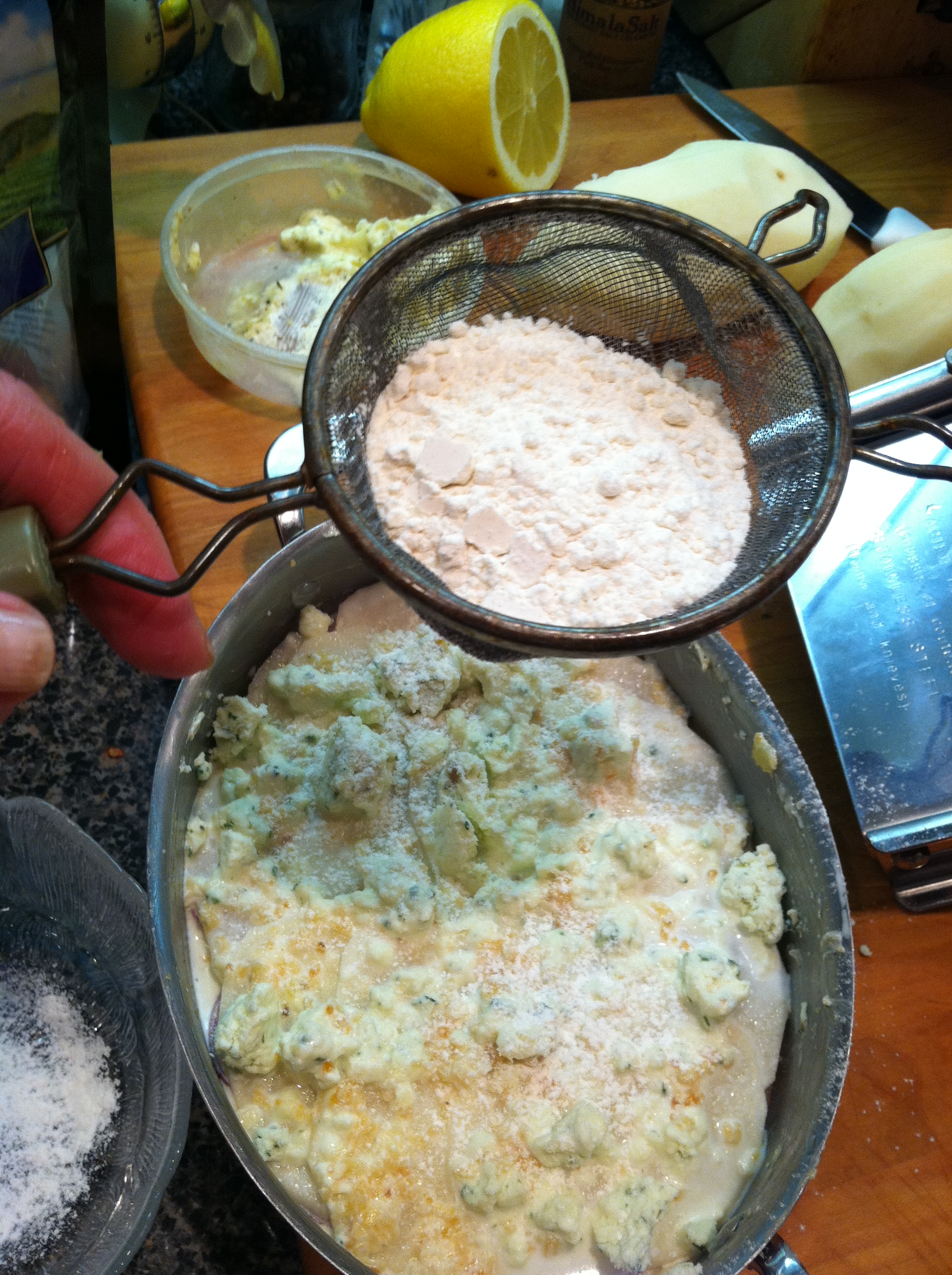 Butter the dish, place a single layer of sliced shallots on the bottom of the pan, top with potatoes laid in a single layer, top with shredded cheese, spoon 1/4 cup of warm cream, sprinkle with salt and pepper, drizzle a light sprinkling of flour and repeat layering until the dish is full. The top layer should be cheese.