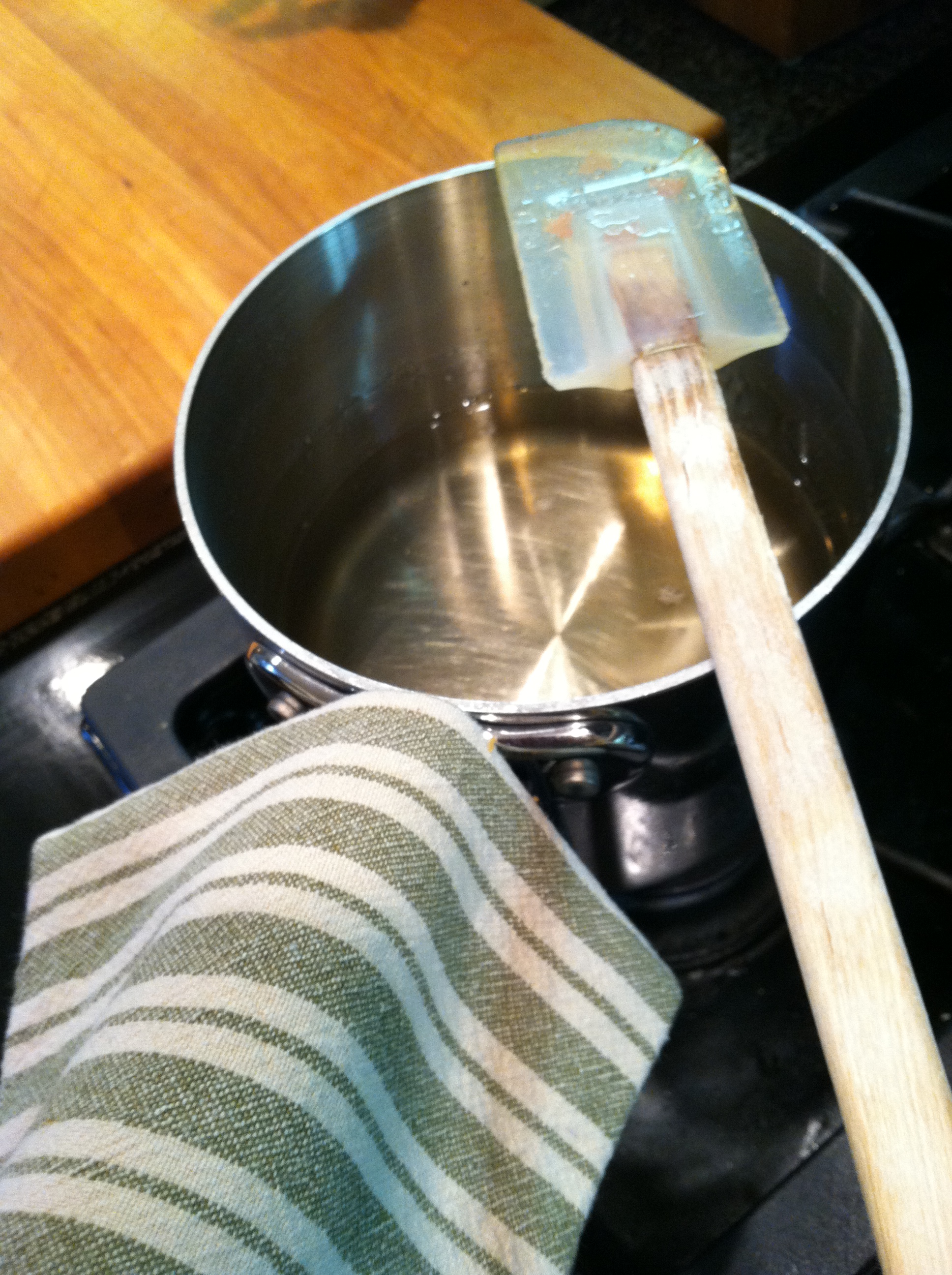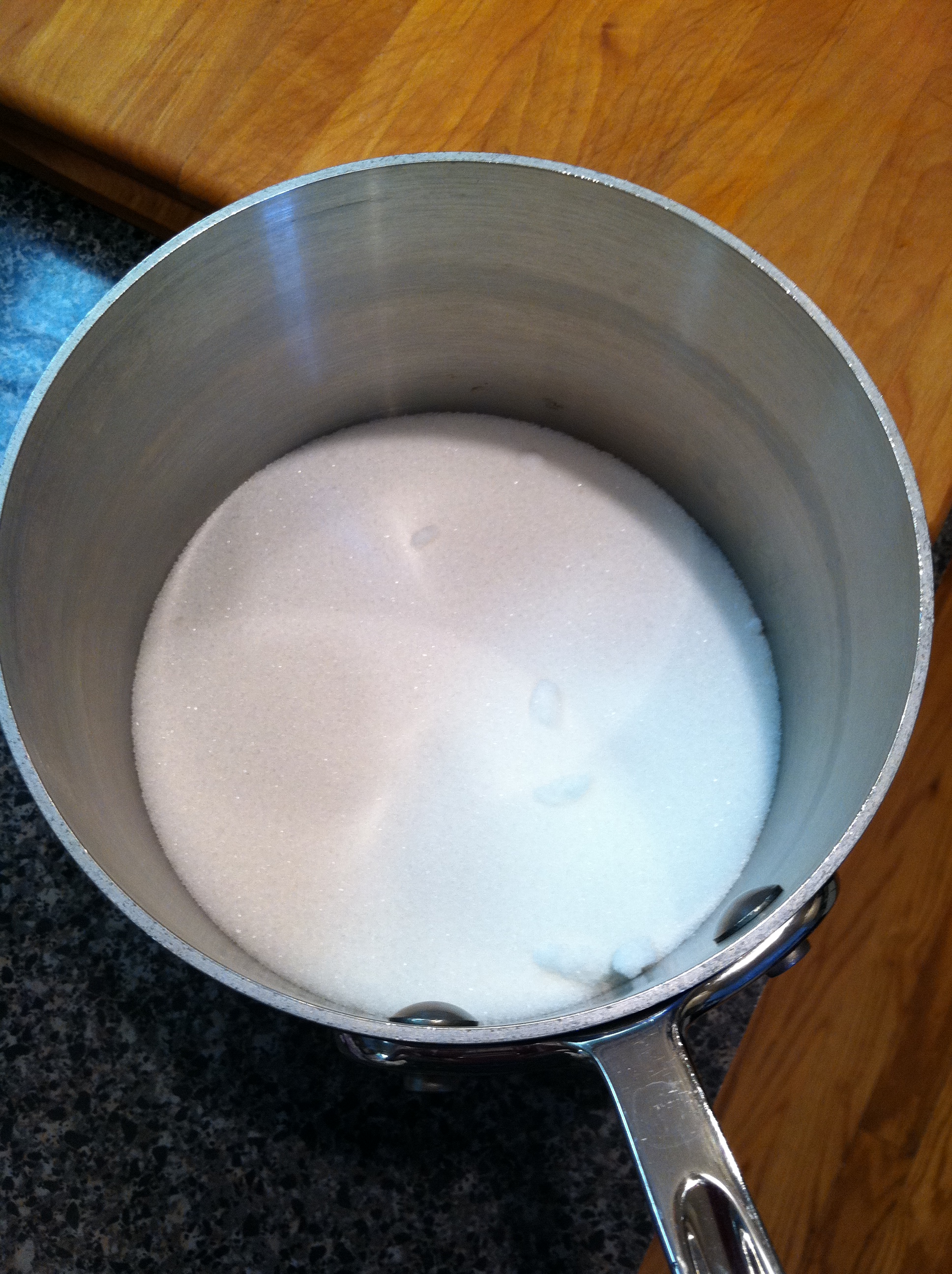 While the sugar syrup is cooling, put some kind of “sign or symbol” on the  handle so others know the pot and contents are hot and to leave the pot alone.