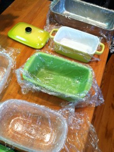 Line your chosen molds with cellophane wrap. Give the wrap a light spray with a pan release spray. This allows the chocolate to be removed from the pan easily once it has chilled.