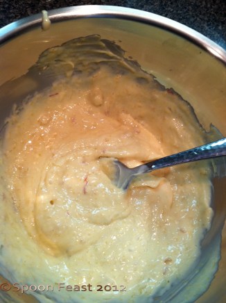 As the aioli sits, it will become more yellow. Stir the color in so there is uniform color and saffron flavor.