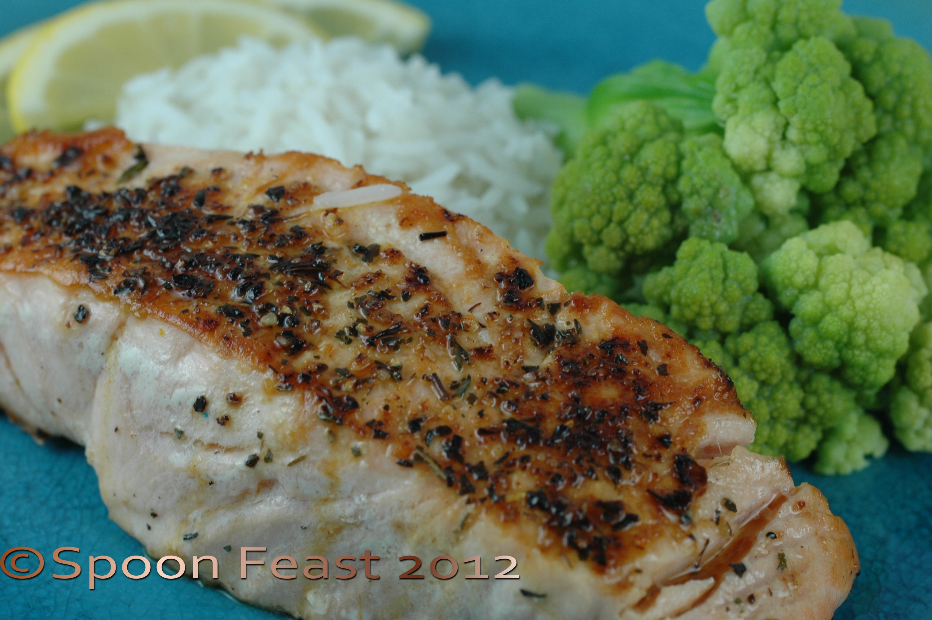 Place the salmon in the pan, top serving side down first. Sear it until it is golden brown. If the fish is ‘sticking’ to the pan, wait a minute or two. When the salmon is ready to turn, it will release on its own.