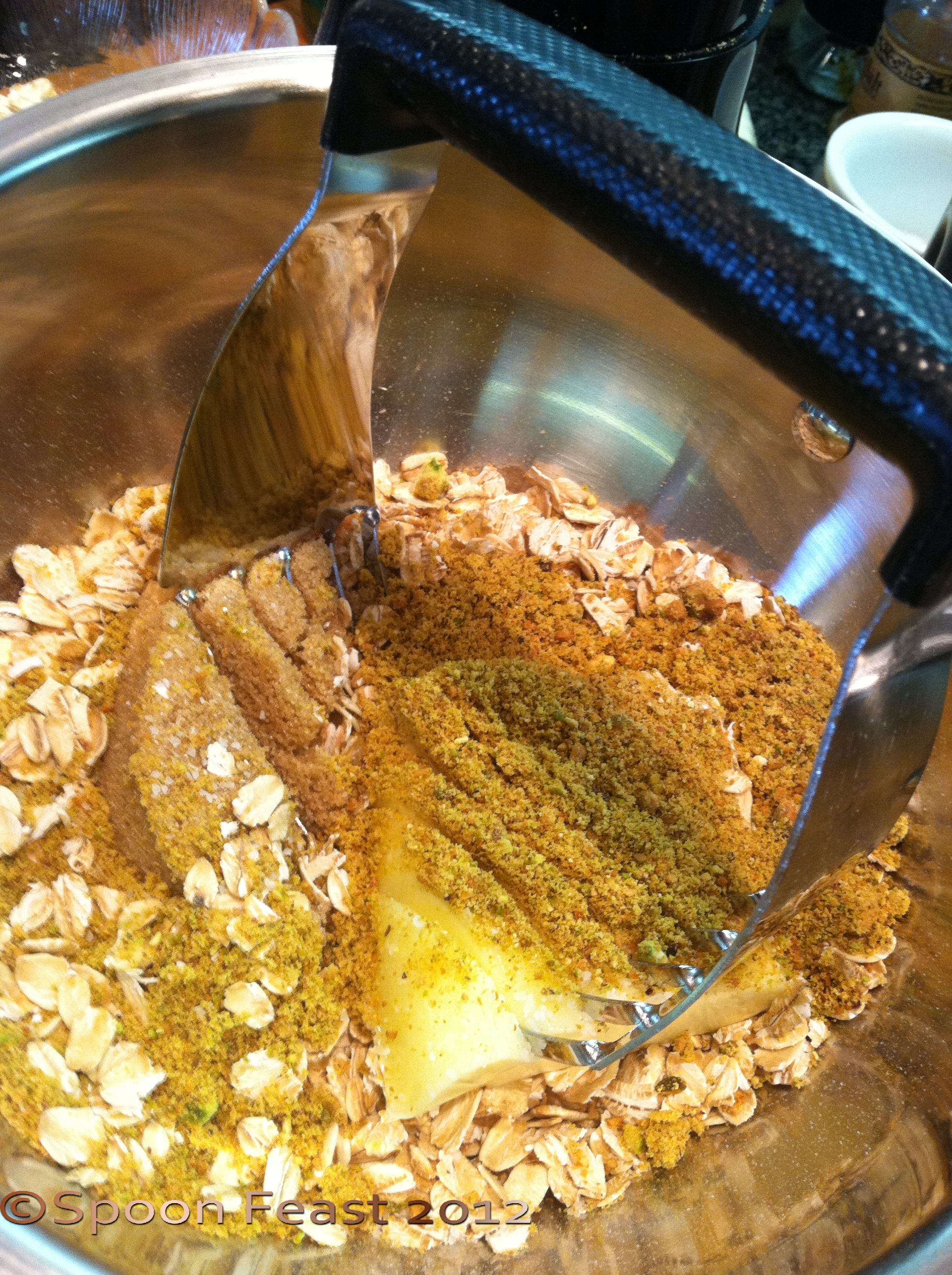 Combine the oats, sugar and seeds and salt, cut in the butter until the mixture is like coarse cornmeal.