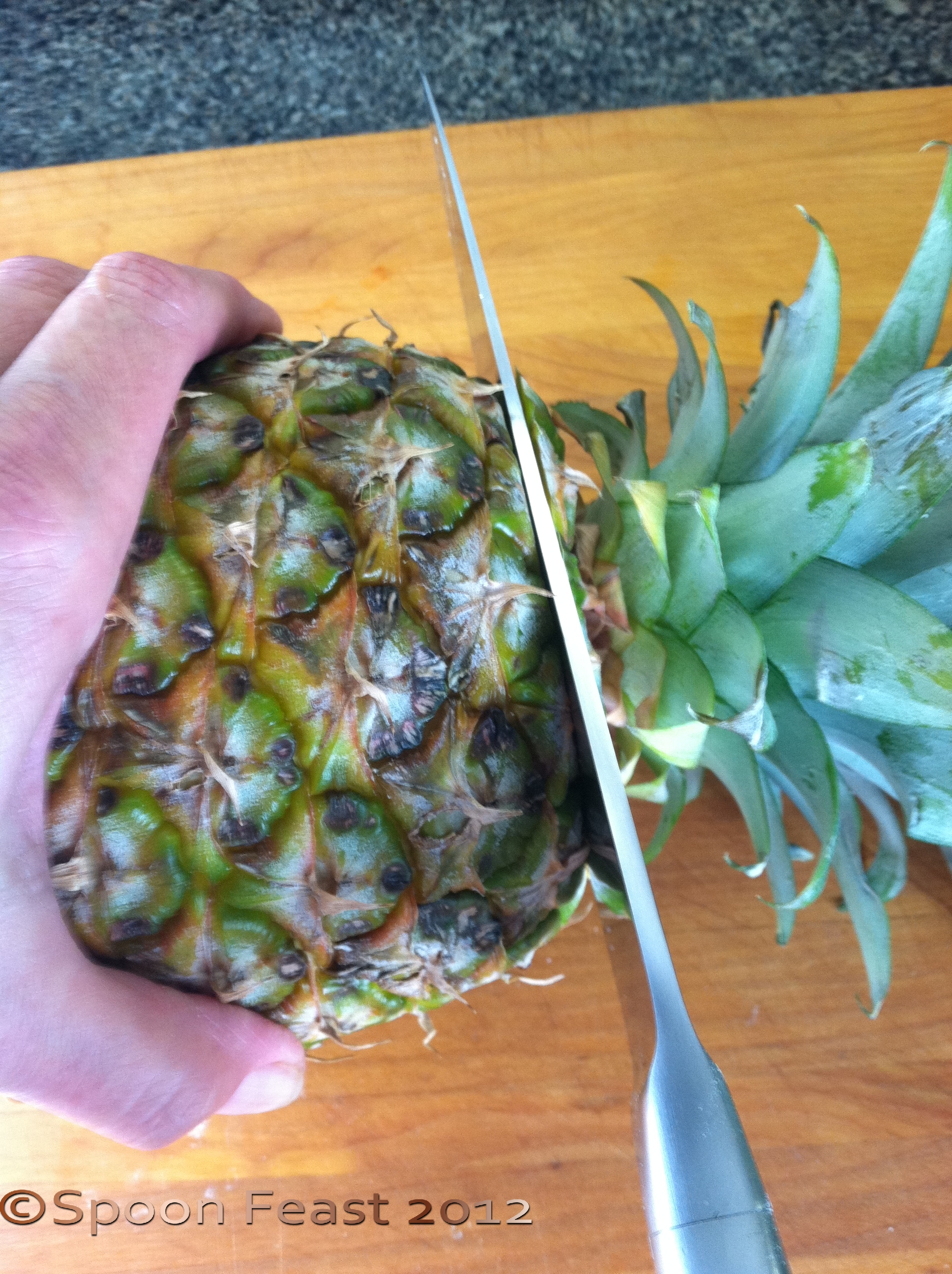 Stand the pineapple up and make a cut from the top to the bottom just behind the round brown ‘eyes’