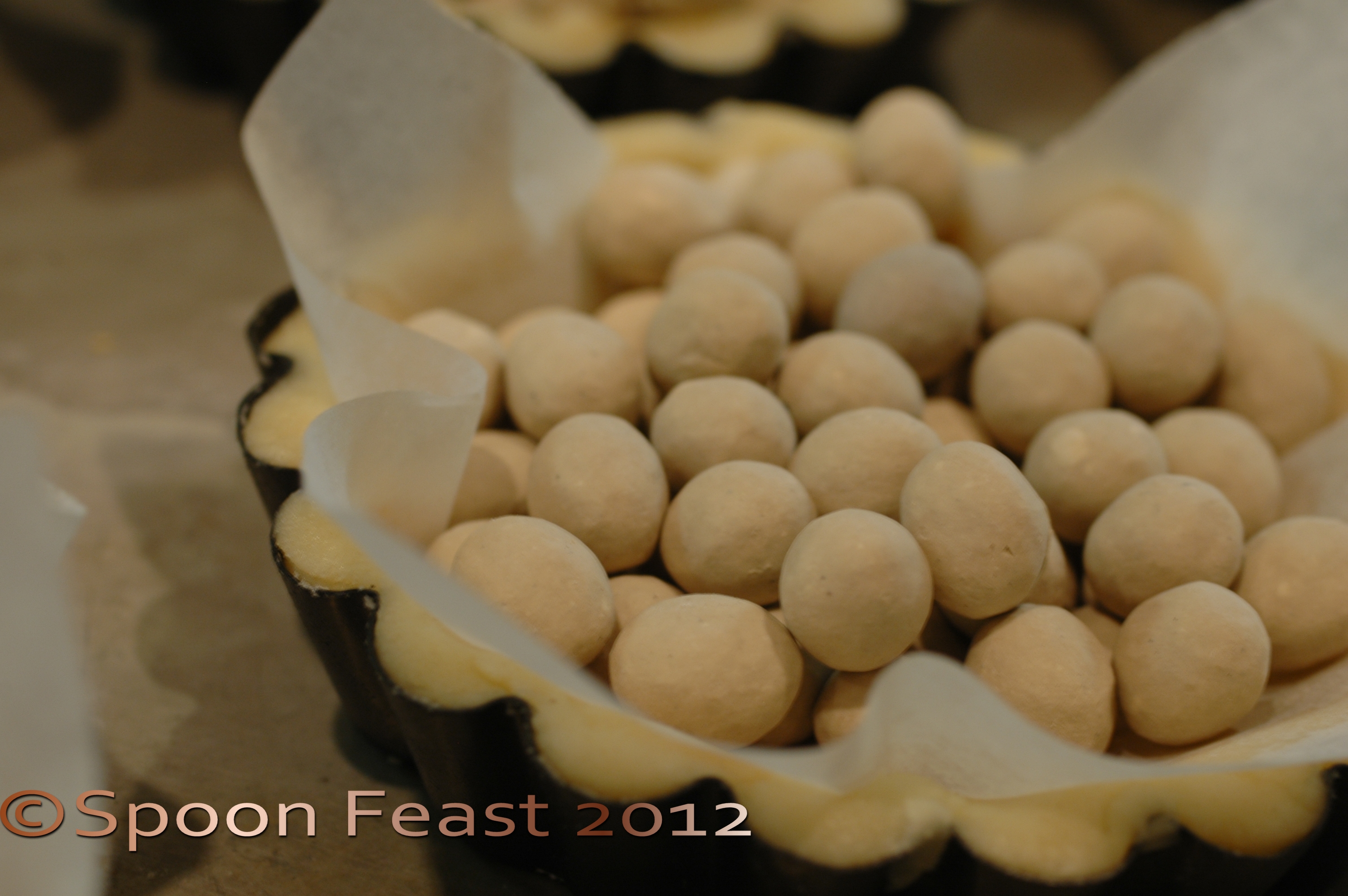 Dock the surface of the dough; cover each tin or mold with parchment, fill with rice or beans and bake at 375°F until the crust is golden brown.