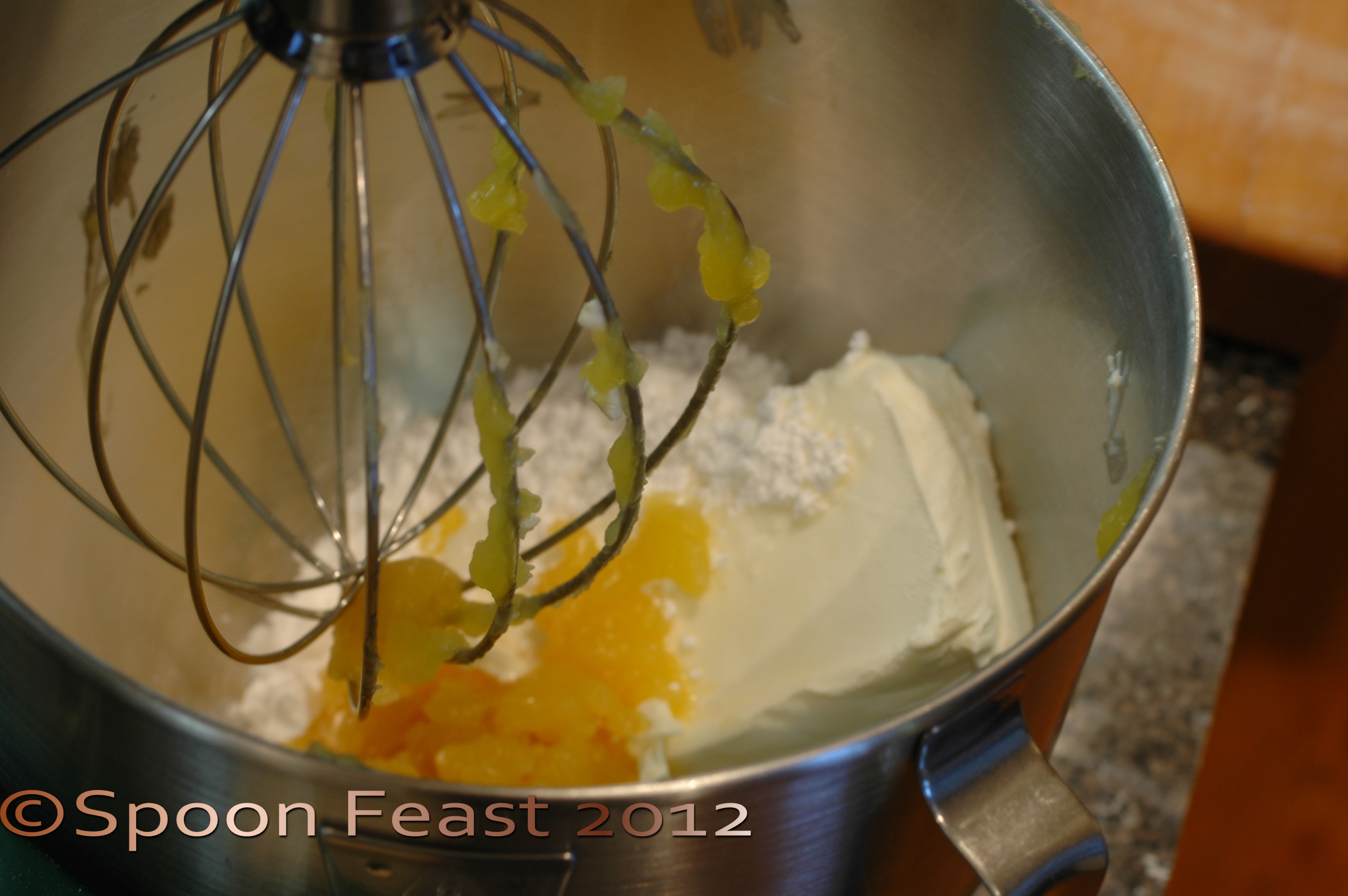 Warm the cream cheese slightly in the microwave, it combines better with other ingredients when it isn’t cold. In the bowl of a mixer, add the cream cheese and lemon curd and confectioners sugar.