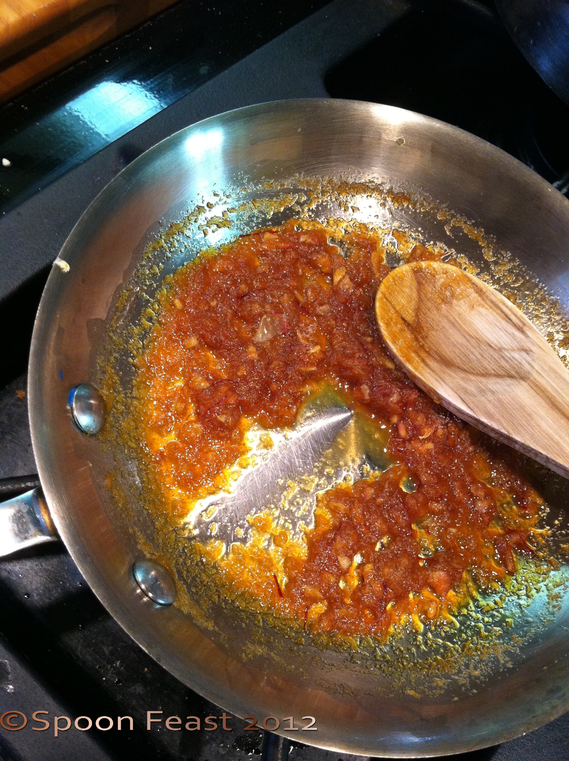 Cook the mixture down until it remains separated when a spoon is drawn through the mixture on the bottom of the pan as shown.