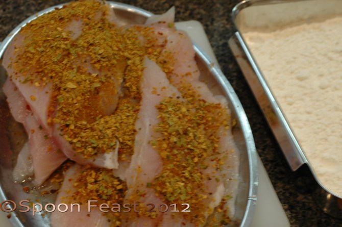 Here, catfish is getting seasoned with lemon ginger seasonings before breading
