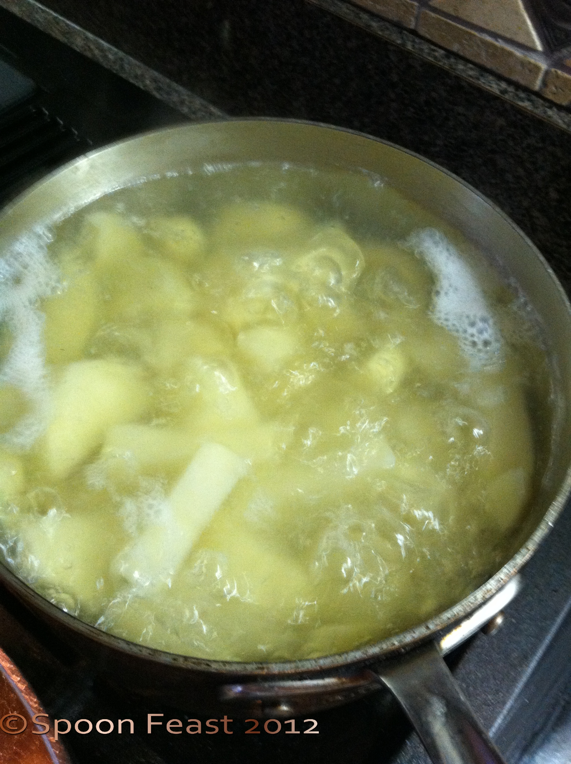 Once the water comes to a boil. test to see how done the potatoes are. They should be almost done when they come to a boil.