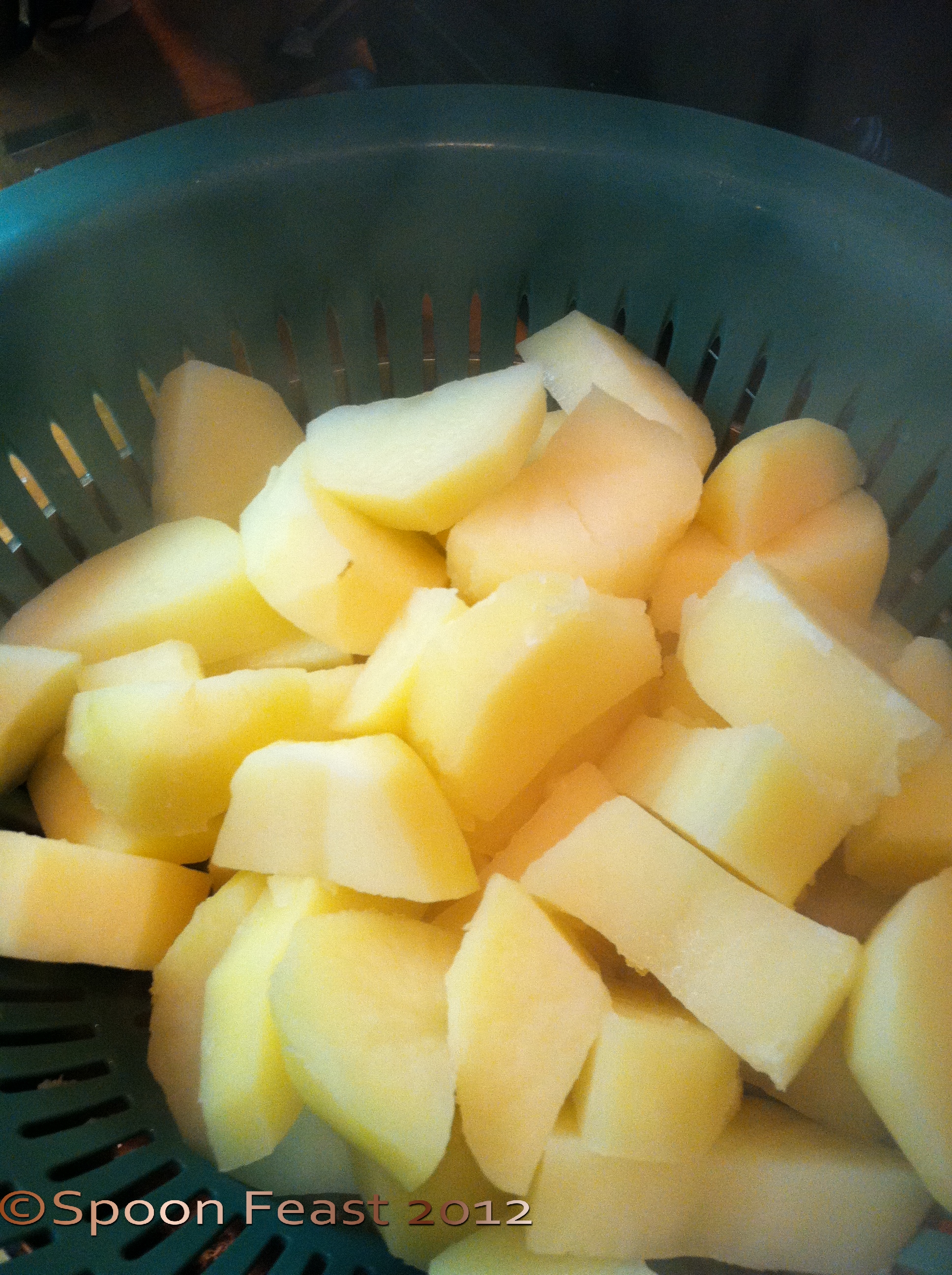 Wash and peel to potatoes. It is advisable to use 1 potato per person plus 1. Left over mashed potatoes can be used in many ways and you will be lucky if there are any left over.