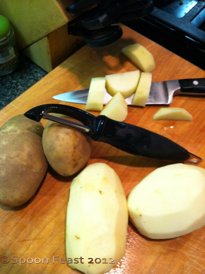 Wash, peel and cut potatoes into uniform sizes so they cook at the same rate.