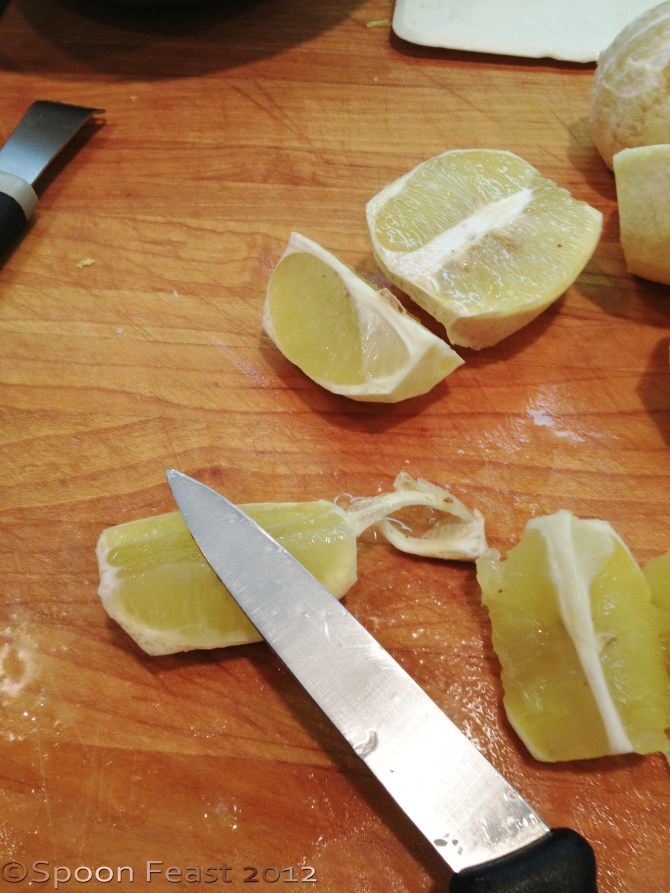Peeled lemons. Sometime the citrus will have a thick pith between the zest and the fruit. Remove the peel, cut the pith away just as you would to remove the peeling for sectioning citrus. Refer to the “Related Article” below.