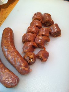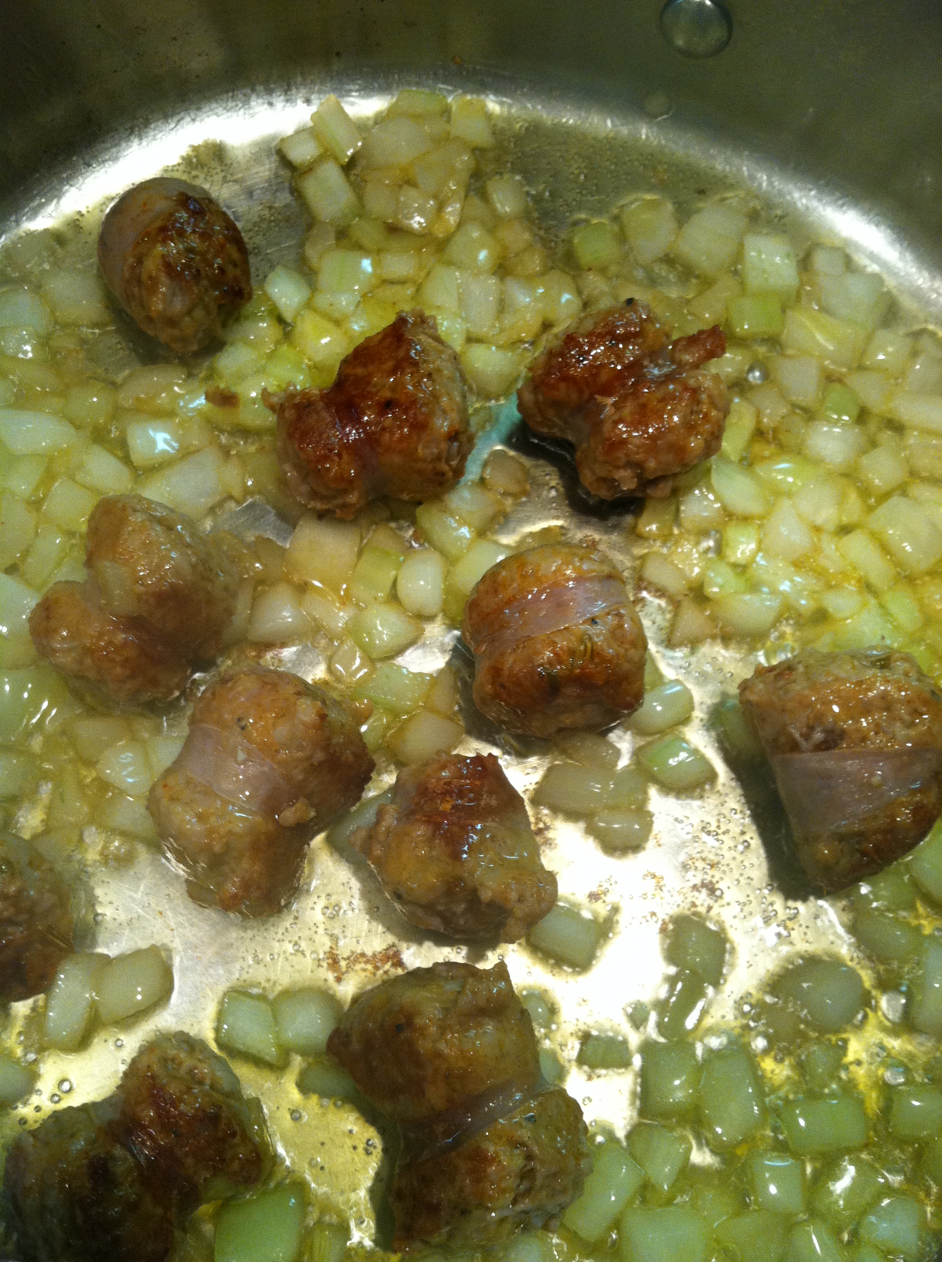 Slice the sausage into 1″ slices. Saute in olive oil for 3 minutes.