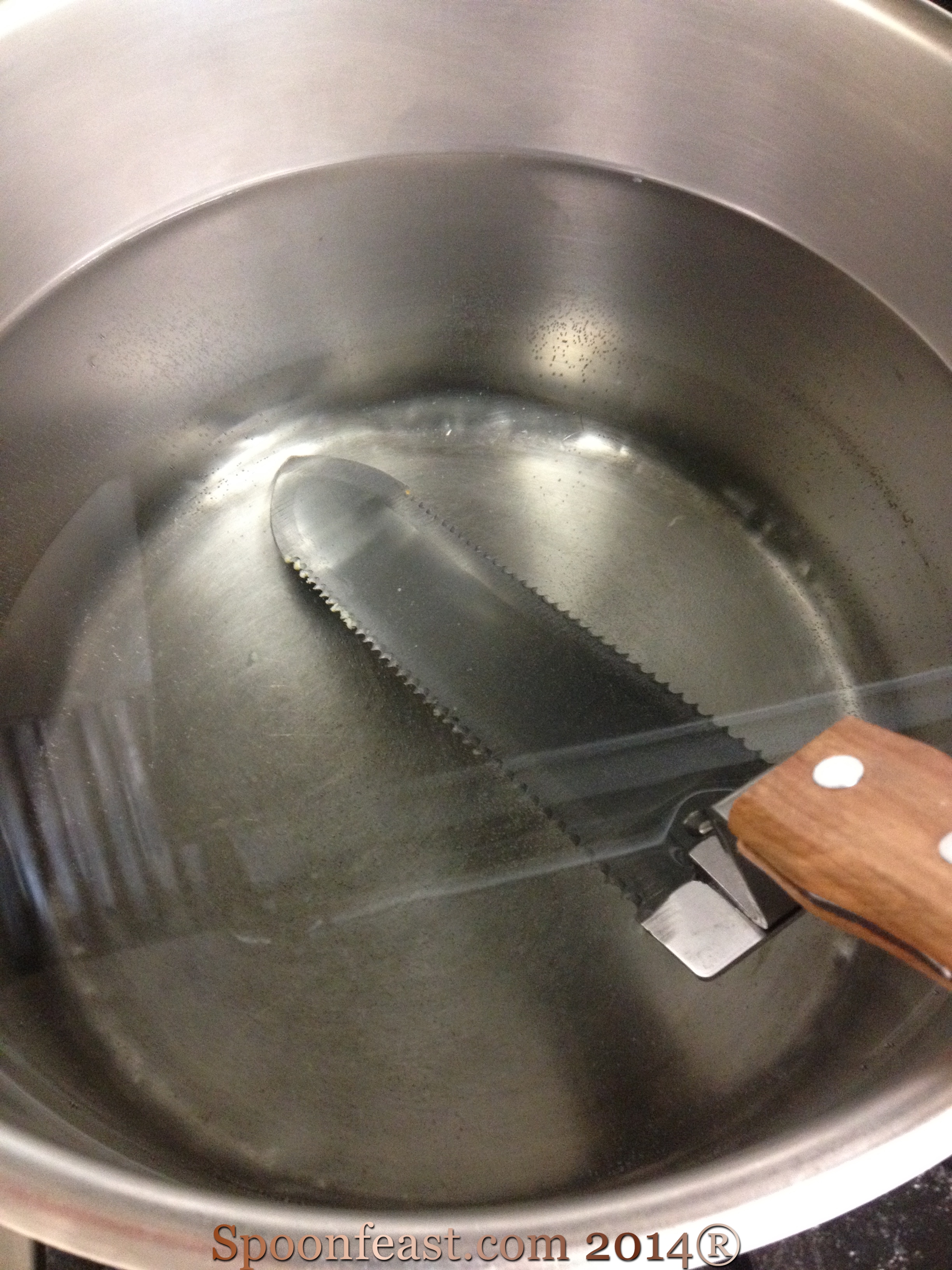 Once you have everything ready to go, one of the frames is placed so the wax caps can be removed from both sides of the frame using a warm knife made for doing just these kinds of things. Catching the wax caps in a bucket below is a great idea as this is “virgin” beeswax, perfect for making lip balms and body lotions; just wash the honey out gently in cool water.