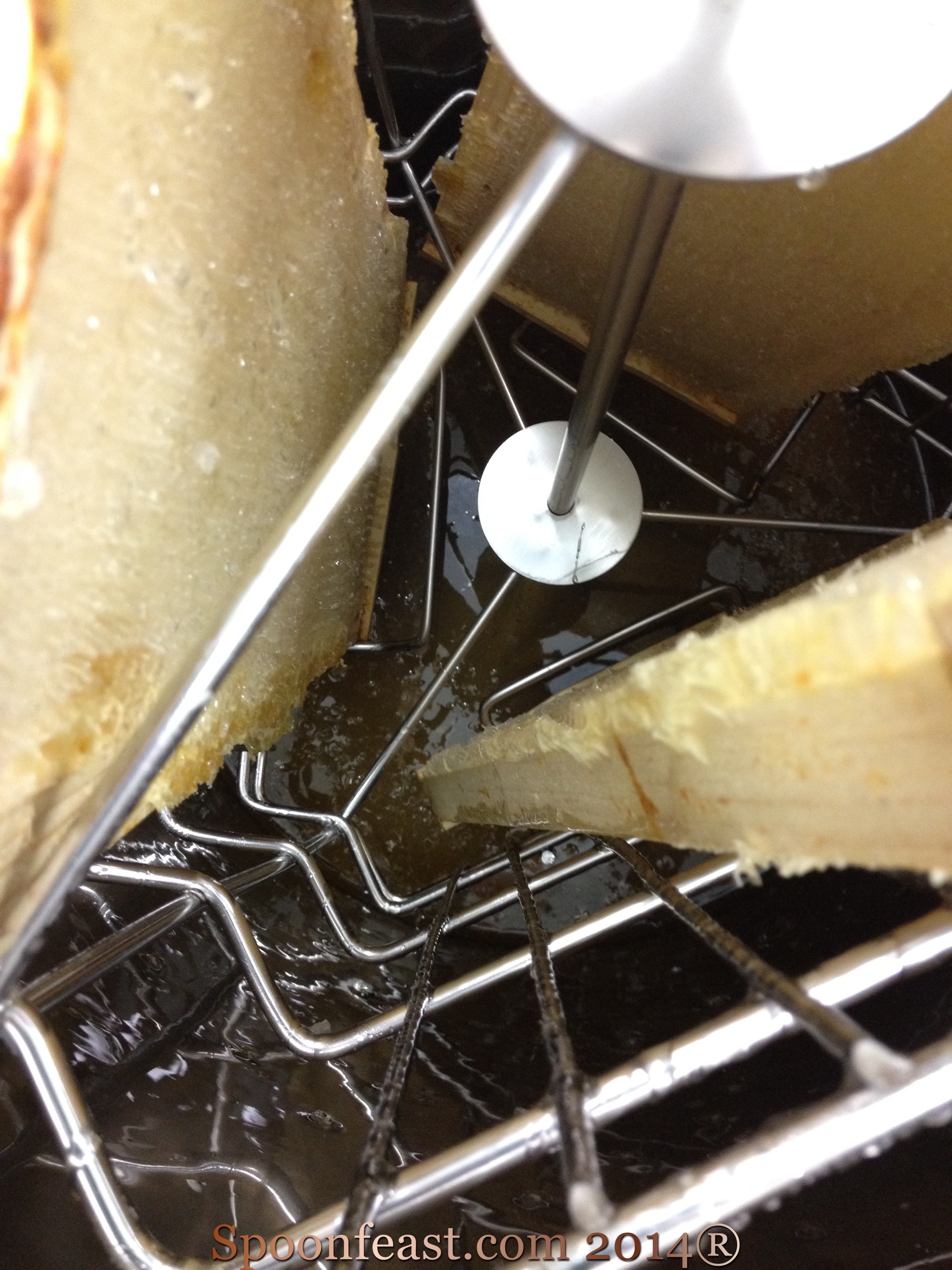 This batch sat for 8 1/4 hours before testing the cleave of the curd. When it is ready to test, you should see a thin layer of whey over the curd and a slight separation from the sides of the pot.