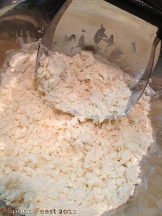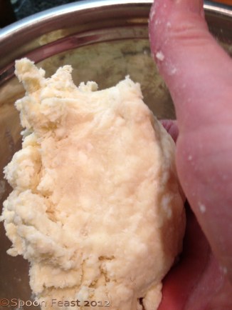 Easily done by hand, you can also use a food processor, just pulse the ingredients without the water, add water, bit by bit to make the dough mass. You may use all the water, only some or you may need more. It depends on how much moisture your flour holds.