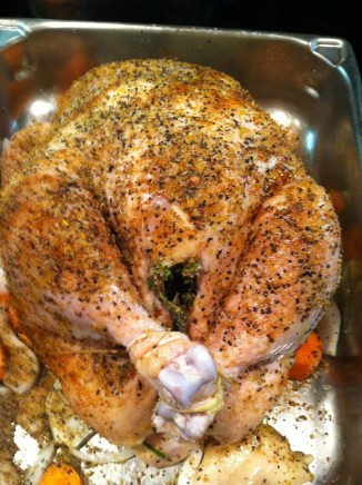To give the bird some flavor while roasting, insert herbs, onion and garlic into the cavity. For this bird I used rosemary, thyme and onion and a bay leaf.