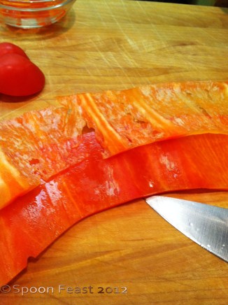 Slice the pepper so it becomes one long strip. Lay the pepper out with the skin side down. Remove the seeds and ribs from inside the pepper.
