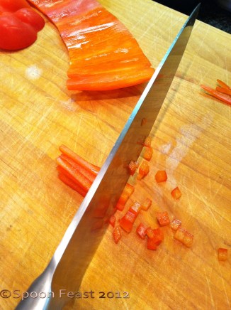 Make long thin slices from the pepper (Julienne cut), then turn the strips and cut them into cubes. Do this carefully so you create a bowl full of nicely diced peppers.