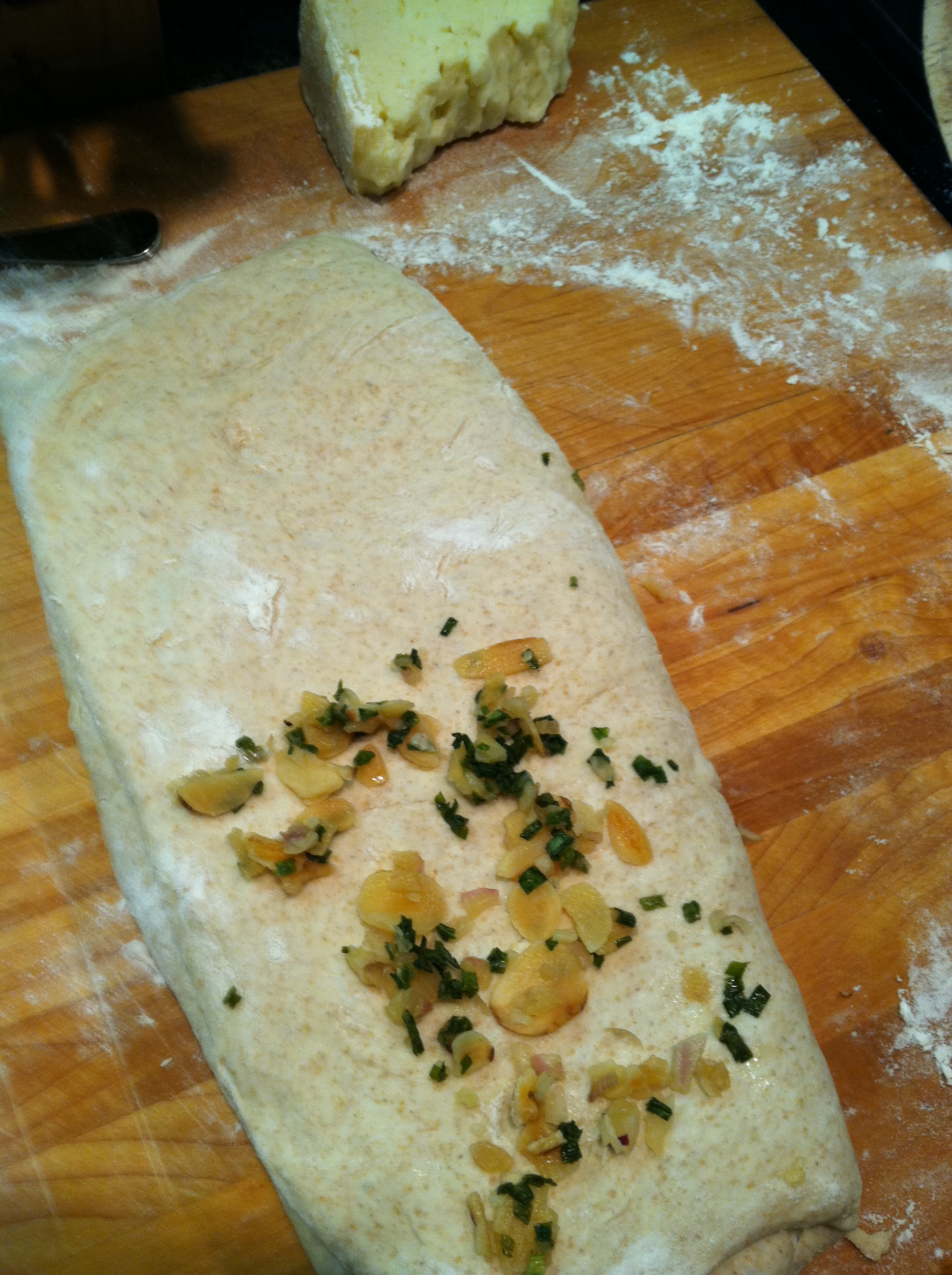 Roll or pat the dough into another rectangle and spread any remaining onions and seeds over the surface and fold again; repeating 4 times, dusting sticky spots as you work.